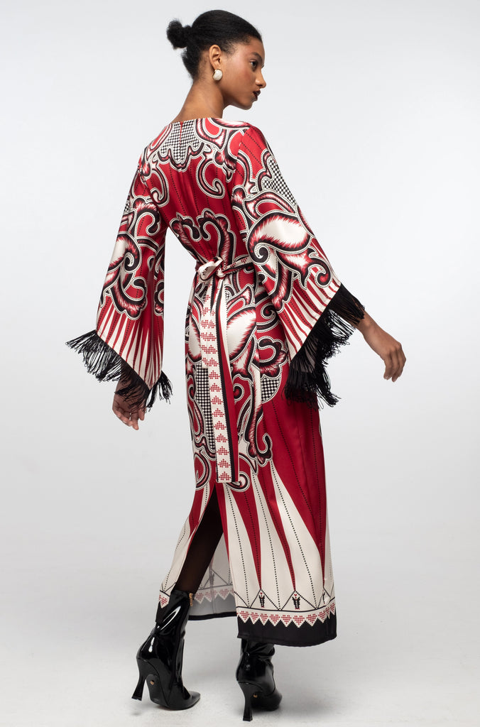 Mακρύ φόρεμα "PEACE AND CHAOS" που ξεχωρίζει για το έντονο κόκκινο/ecru all-over print του και τις μαύρες λεπτομέρειες σε silky-touch ύφασμα.