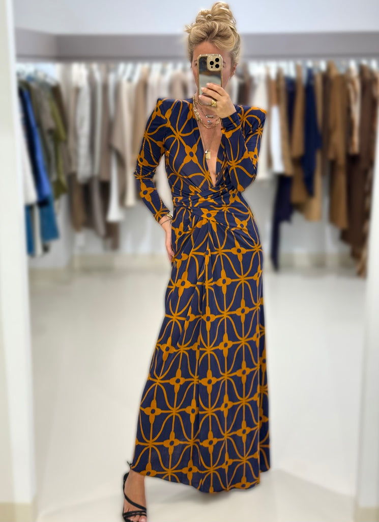 Διαθέτει κρυφό φερμουάρ στη πλάτη, κομψές βάτες, ενώ το μοναδικό flower print πάνω σε σκούρο μπλε φόντο το καθιστούν ιδανικό για μοναδικές εμφανίσεις.
