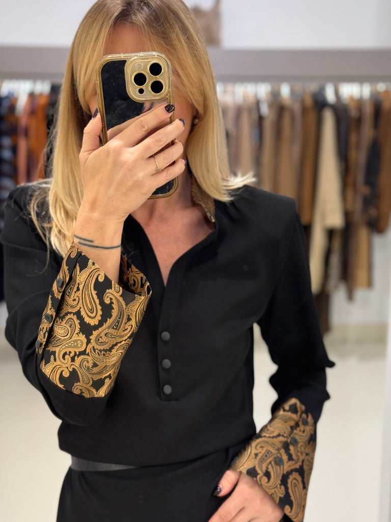 Crepe κοντό φόρεμα "C.MANOLO" σε ίσια γραμμή που κολακεύει τη σιλουέτα, λαιμόκοψη V με μικρά κουμπιά και ιδιαίτερες λεπτομέρειες από lurex paisley μοτίβο στα μανίκια και στο κάτω μέρος.