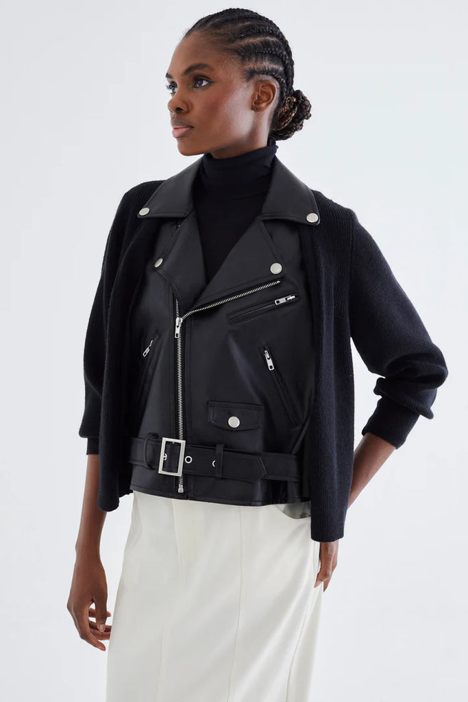 Jacket "JOVONNA" σε μαύρο χρώμα που συνδυάζει εύκαμπτη δερματίνη με soft πλεκτό σαν ζακέτα, δημιουργώντας την αίσθηση δύο ξεχωριστών κομματιών.