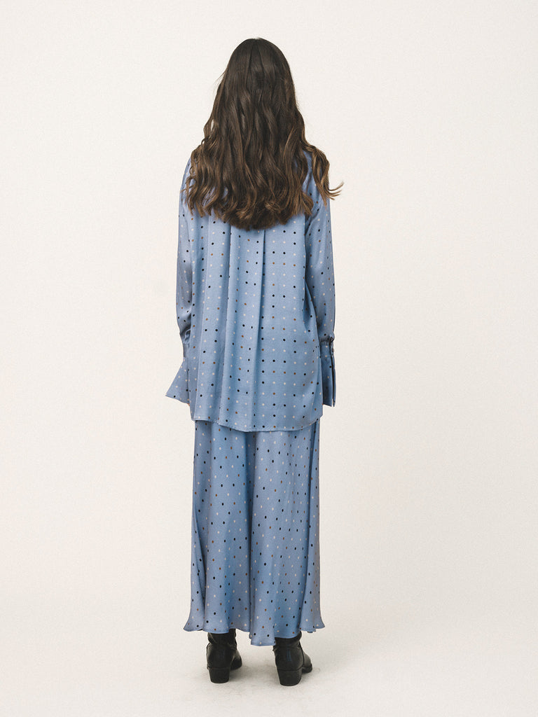 Silky-touch πουκάμισο "LOVE AND ALICIA" με στρογγυλή λαιμόκοψη και μοναδικό μοτίβο από dots πάνω σε μωβ φόντο.