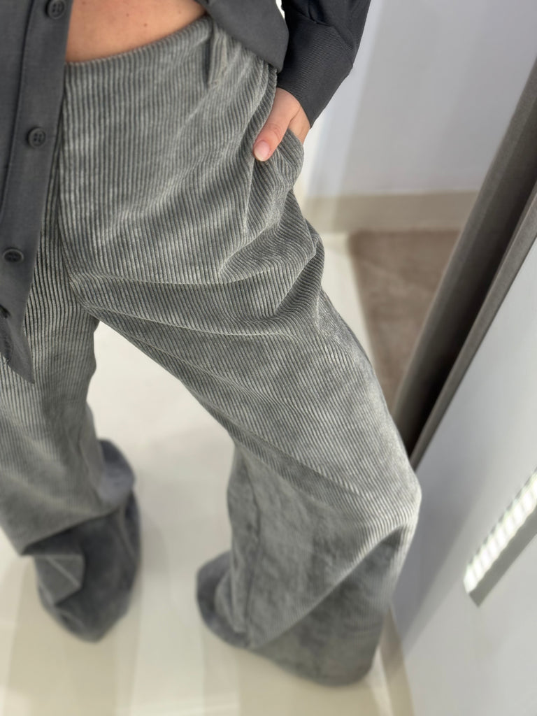 Ψηλόμεσο κοτλέ παντελόνι "MOUTAKI" σε grey απόχρωση, wide-leg γραμμή, λάστιχο στη μέση για άνετη εφαρμογή και φερμουάρ στο πλάι.
