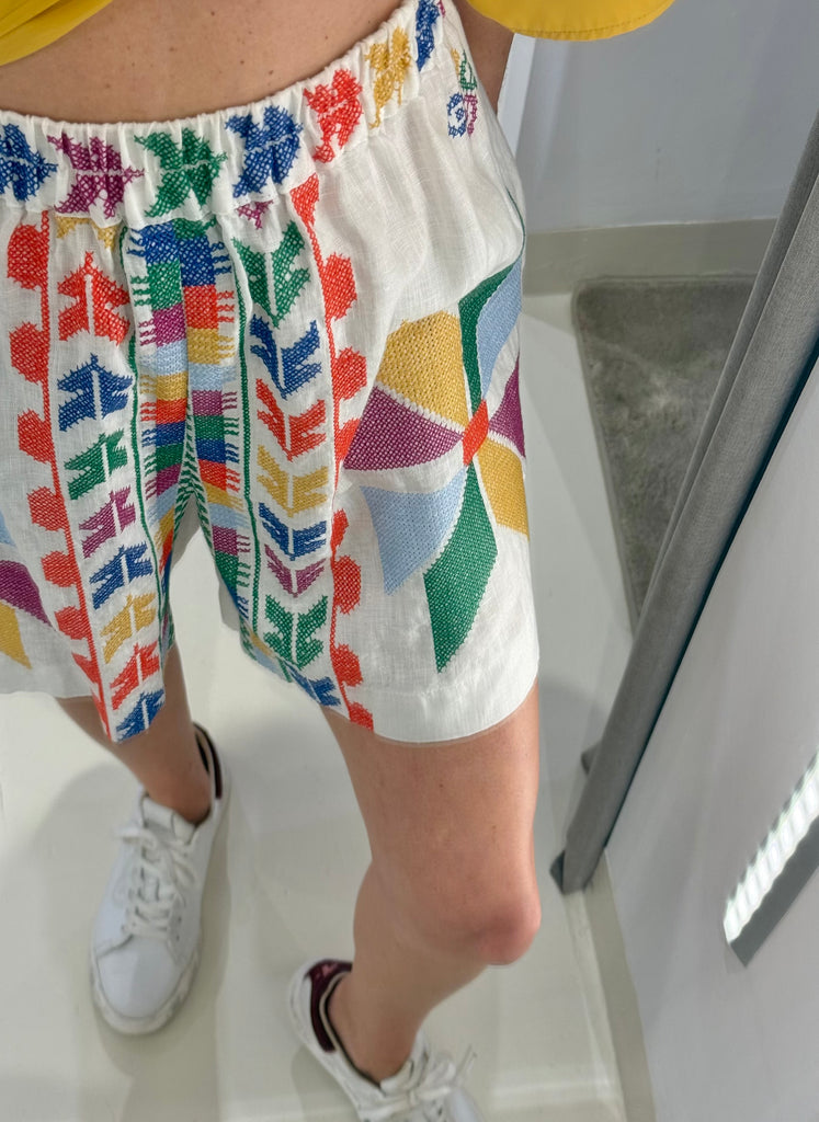 Ψηλόμεσο σορτς "GREEK ARCHAIC KORI" με λεπτομέρειες πολύχρωμο κέντημα.