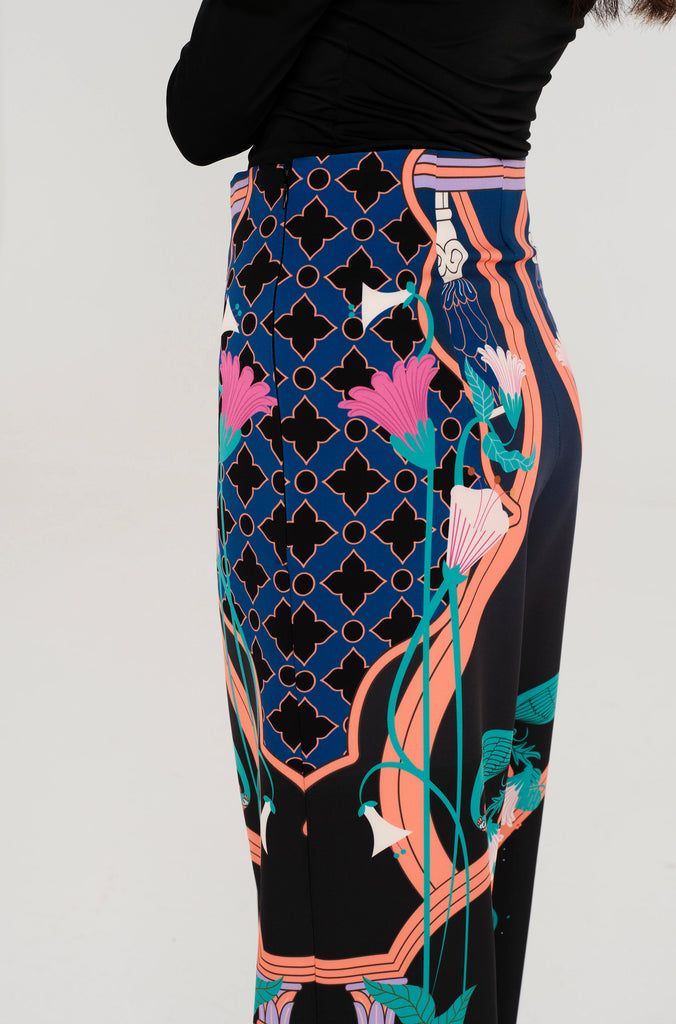 Ψηλόμεσο παντελόνι "PEACE AND CHAOS" σε ίσια γραμμή, με μοναδικά σχέδια της εταιρείας σε απαλές αποχρώσεις, με έμπνευση από την Art Nouveau και κρυφό φερμουάρ στο πλάι.95% Pes - 5% Sp