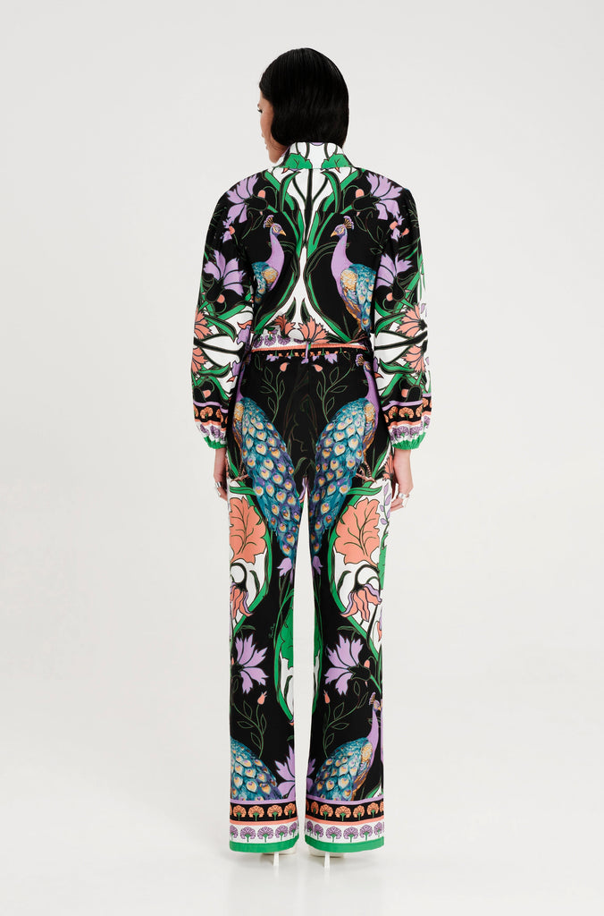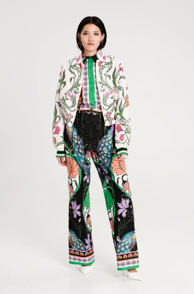 Ψηλόμεσο παντελόνι "PEACE AND CHAOS" σε ίσια γραμμή με έντονα χρώματα και ιδιαίτερο σχέδιο με παγώνια και λουλούδια από ελαστική βαμβακερή ποπλίνα για άνετη εφαρμογή.