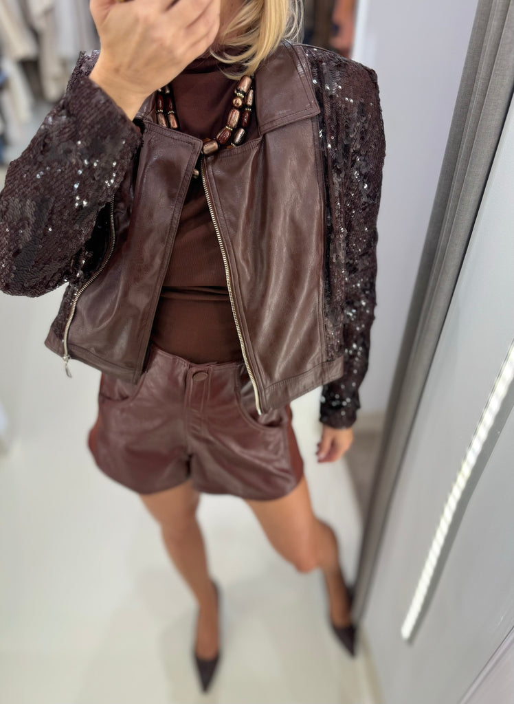 Ψηλόμεσο shorts "OPEN" από ελαστικό ύφασμα σε burgandy απόχρωση και δερματίνη επιφάνεια στο μπροστινό μέρος και στο τελείωμα.