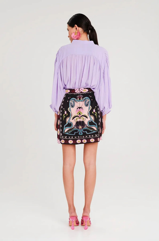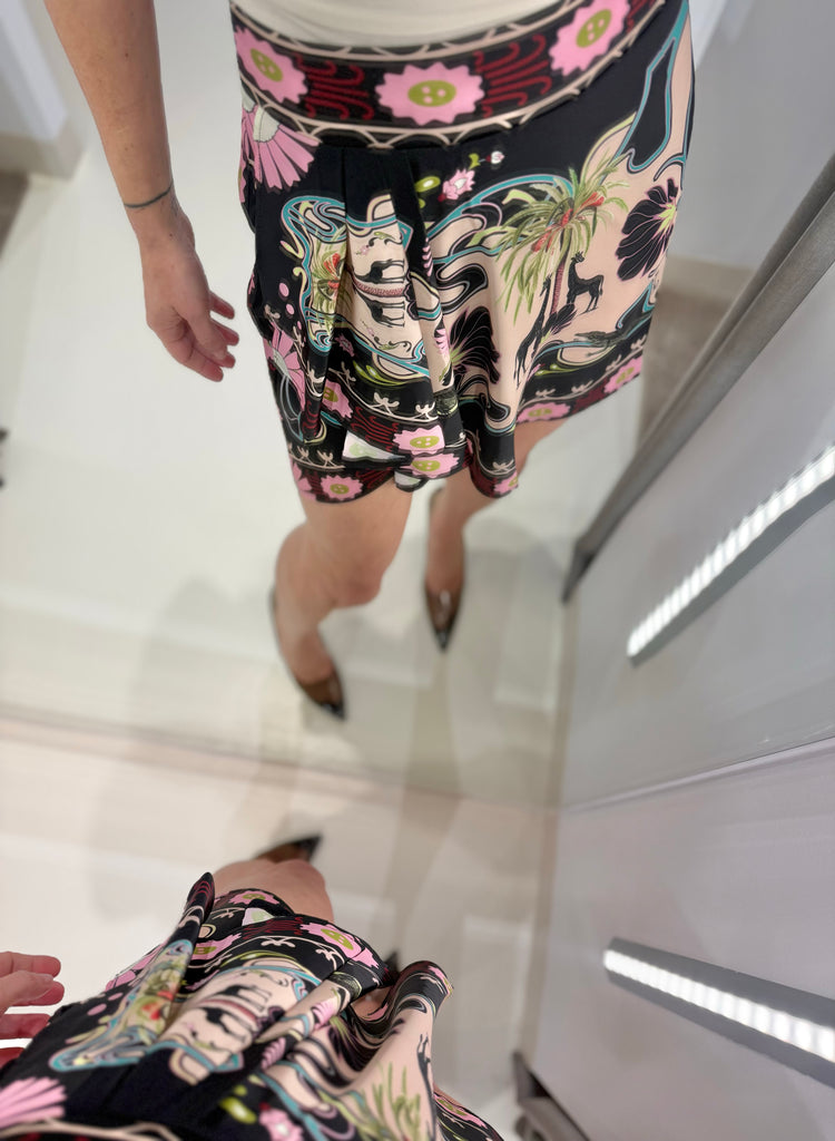 Mini silky-touch skirt "PEACE AND CHAOS" που ξεχωρίζει με το μοναδικό placement print της εταιρείας.