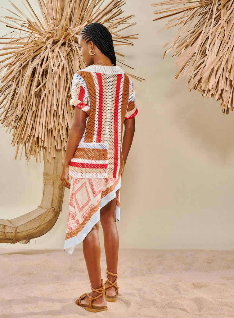 Πλεκτό διάτρητο πουκάμισο "OPEN" με multi ριγέ μοτίβο και μανίκια μέχρι τον αγκώνα.