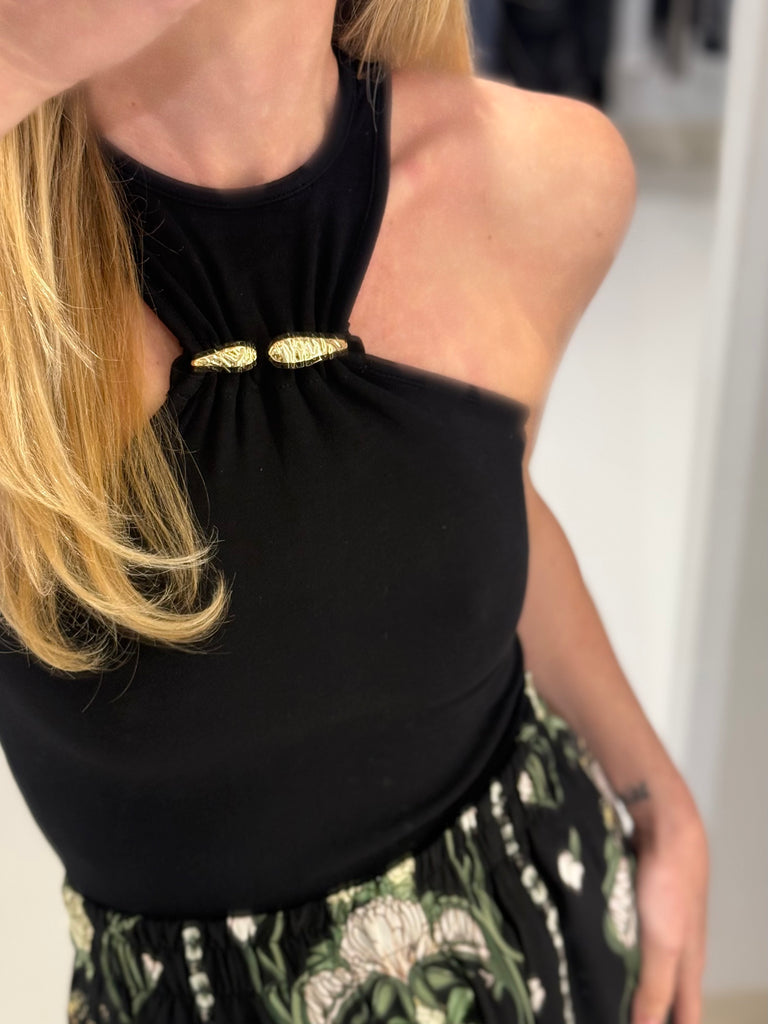 Εφαρμοστό bodysuit "OPEN" με halter λαιμόκοψη που αναδεικνύει κομψά τους ώμους, διακοσμημένο με δύο χρυσές μεταλλικές λεπτομέρειες που προσθέτουν μια shiny πινελιά.