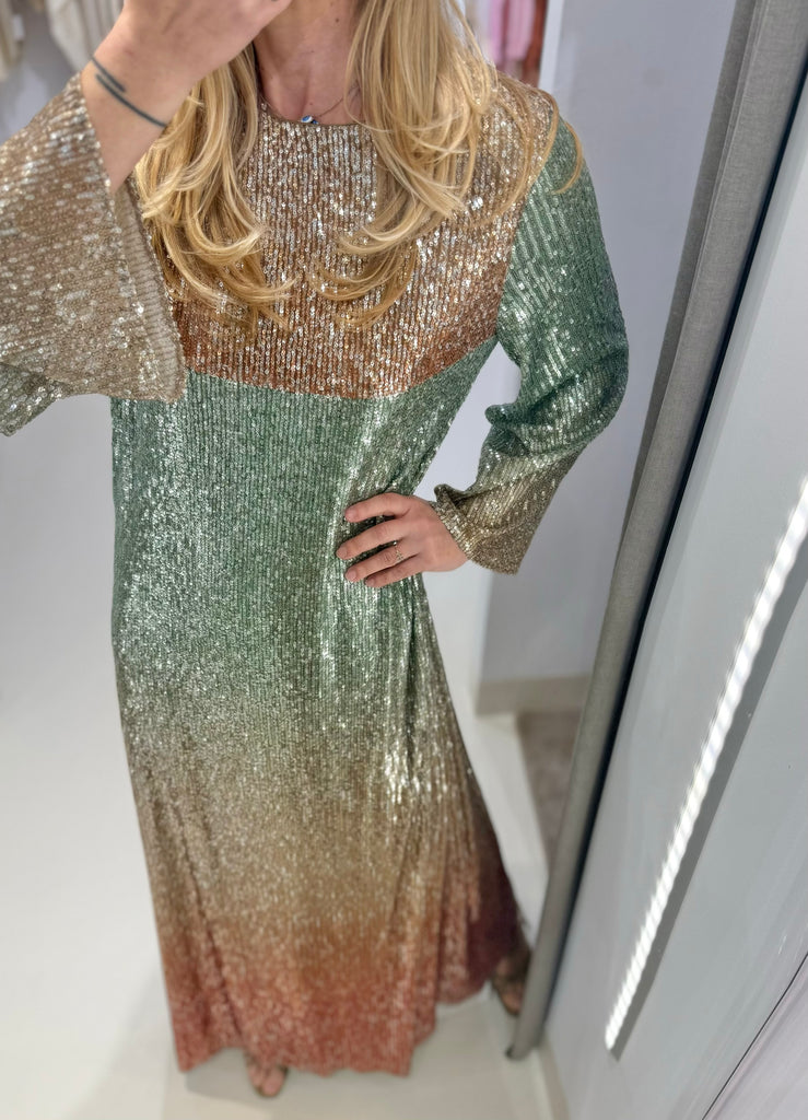 Μακρύ sequinned φόρεμα "ΜOUTAKI" με εντυπωσιακό degrade σχέδιο που μεταβαίνει αρμονικά από πράσινες αποχρώσεις στο επάνω μέρος σε θερμούς gold-bronzer τόνους στο τελείωμα.