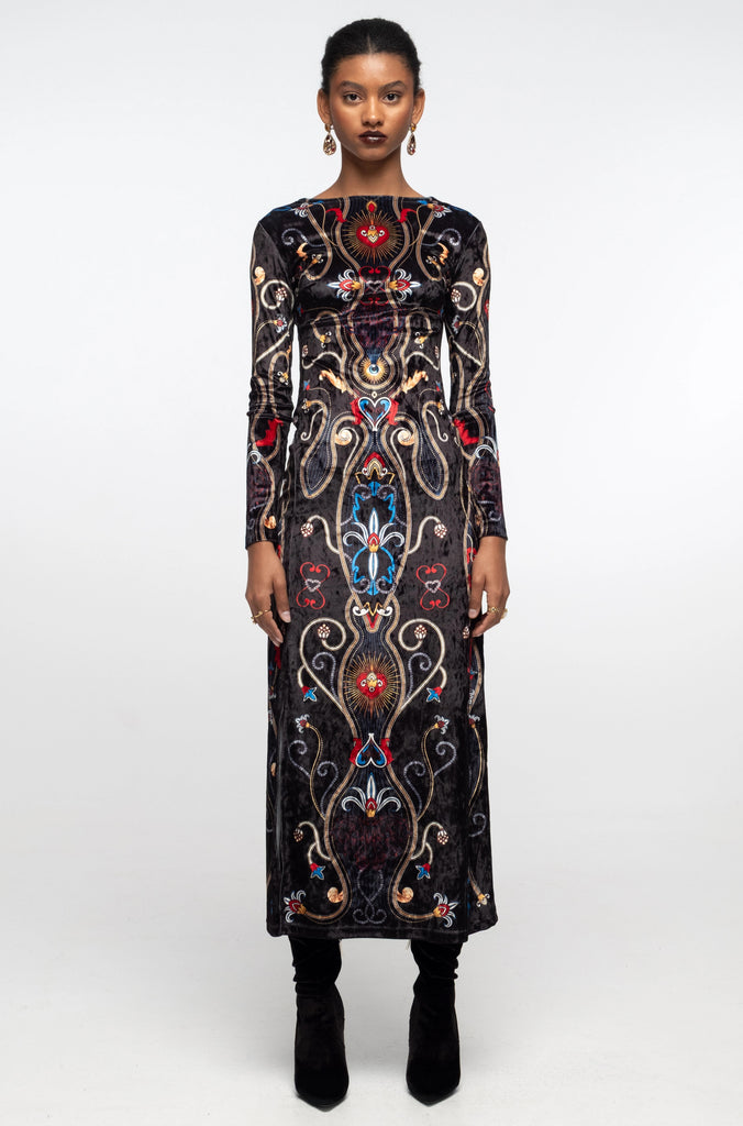 Μακρύ φόρεμα "PEACE AND CHAOS" από ανάγλυφο ice velvet ύφασμα που αγκαλιάζει τη σιλουέτα με εντυπωσιακό placement print της εταιρείας.