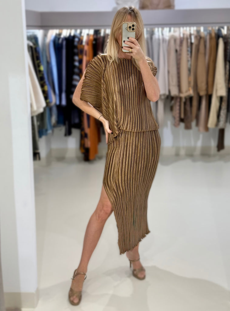 Midi φόρεμα "DAPHNE VALENTE" σε bronze metallic απόχρωση με κομψό slit στο πλάι.