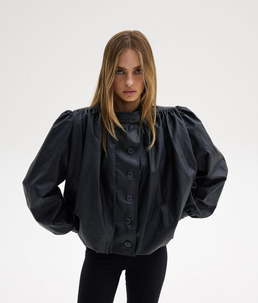 Cropped oversized δερματίνη jacket "SUNSETGO" με εντυπωσιακά shoulder pads και φουσκωτά μανίκια που προσδίδουν δομή με μεγάλα κουμπιά στο μπροστινό μέρος.-100% Pol (100% Viscose inside)