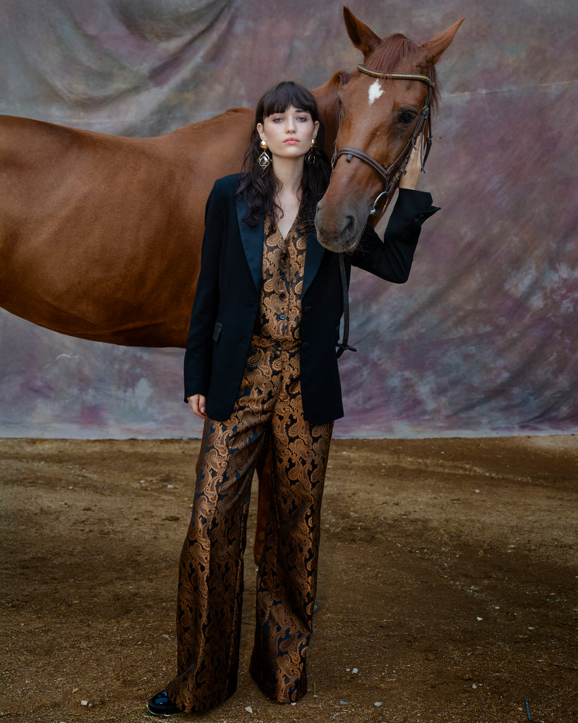Γιλέκο "CMANOLO" με λαμπερό ανάγλυφο lurex paisley μοτίβο στο μπροστινό μέρος που αποπνέει vintage αισθητική ενώ στο πίσω μέρος διαθέτει silky-touch ύφασμα σε απόχρωση bronze και buckle αυξομείωσης για τέλεια μεσάτη εφαρμογή.