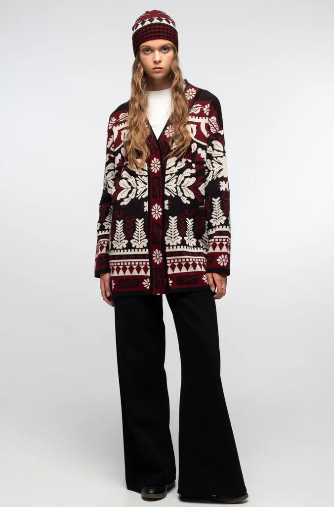 Μοναδικό print της εταιρείας που συνδυάζει ecru και μαύρο χρώμα πάνω σε bordeaux φόντο, φτιαγμένο με την τεχνική intarsia knit.