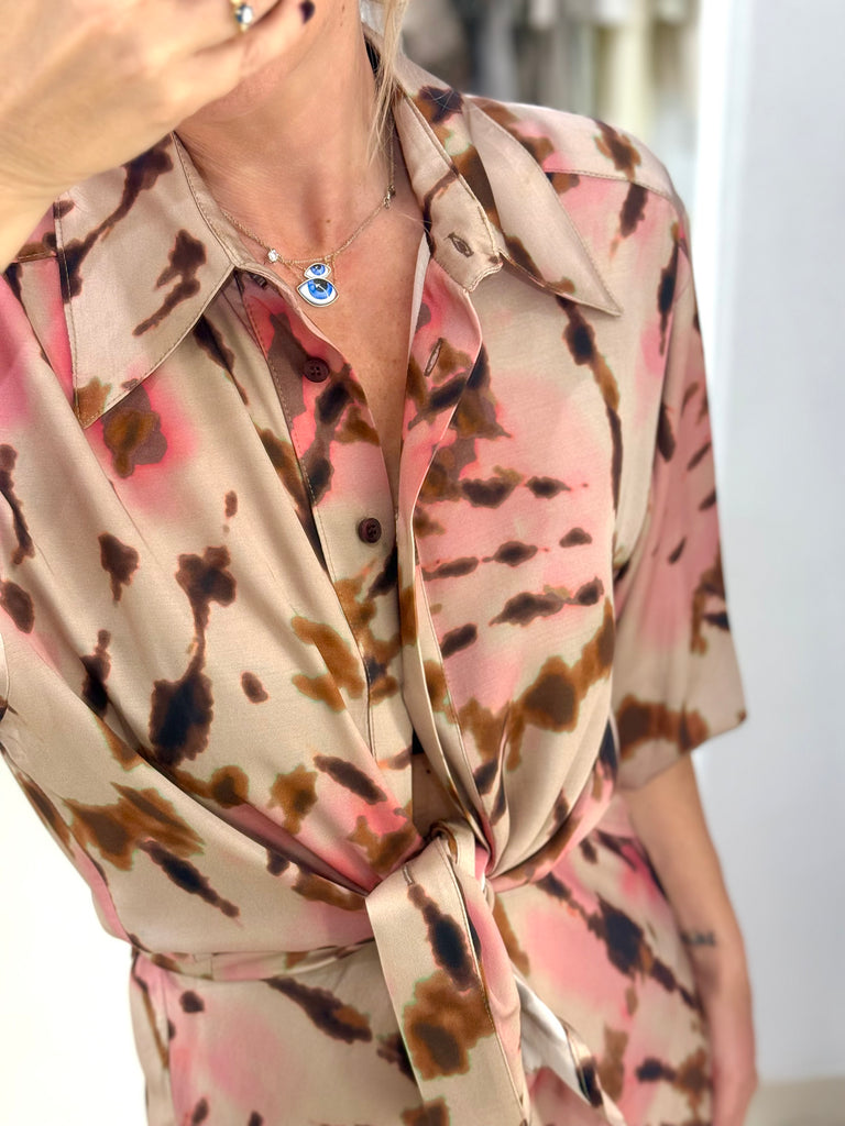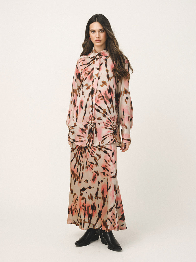 Silky-touch μακρύ πουκάμισο "LOVE AND ALICIA» σε ίσια γραμμή με tie-dye σχέδιο της εταιρείας που ισορροπεί ανάμεσα στο boho και το σύγχρονο.