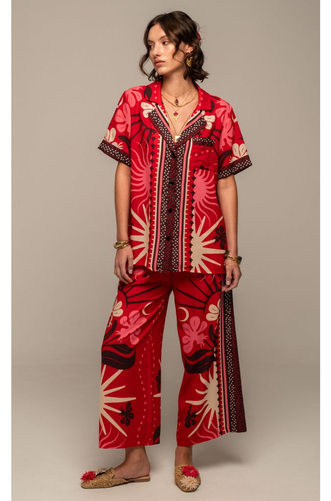 Unisex πουκάμισο "PEACE AND CHAOS" με floral μοτίβo σε ροζ, λευκό και μαύρο χρώμα πάνω σε κόκκινο φόντο και λεπτομέρειες από dots και ρίγες, φτιαγμένο από απαλή και ελαφριά βισκόζη.