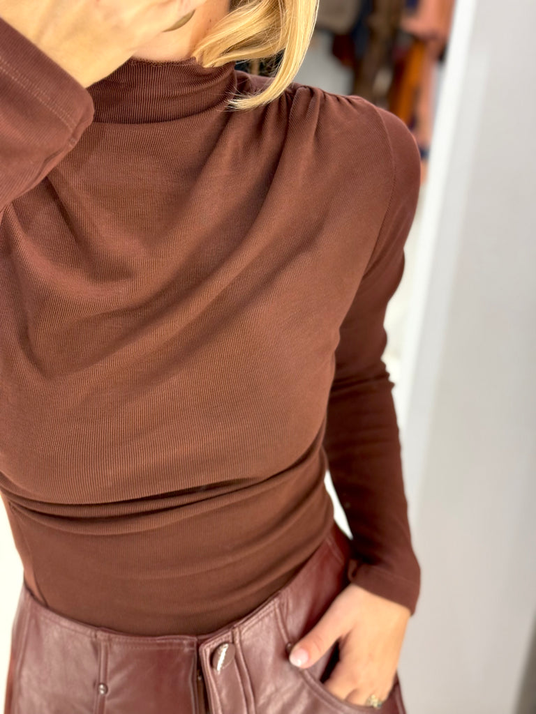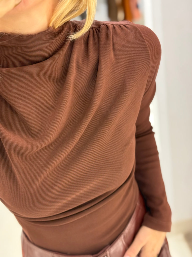 Εφαρμοστό  top "OPEN" με mock-neck και διακριτικές draped λεπτομέρειες στον ώμο και στη μέση που κολακεύουν το σώμα.