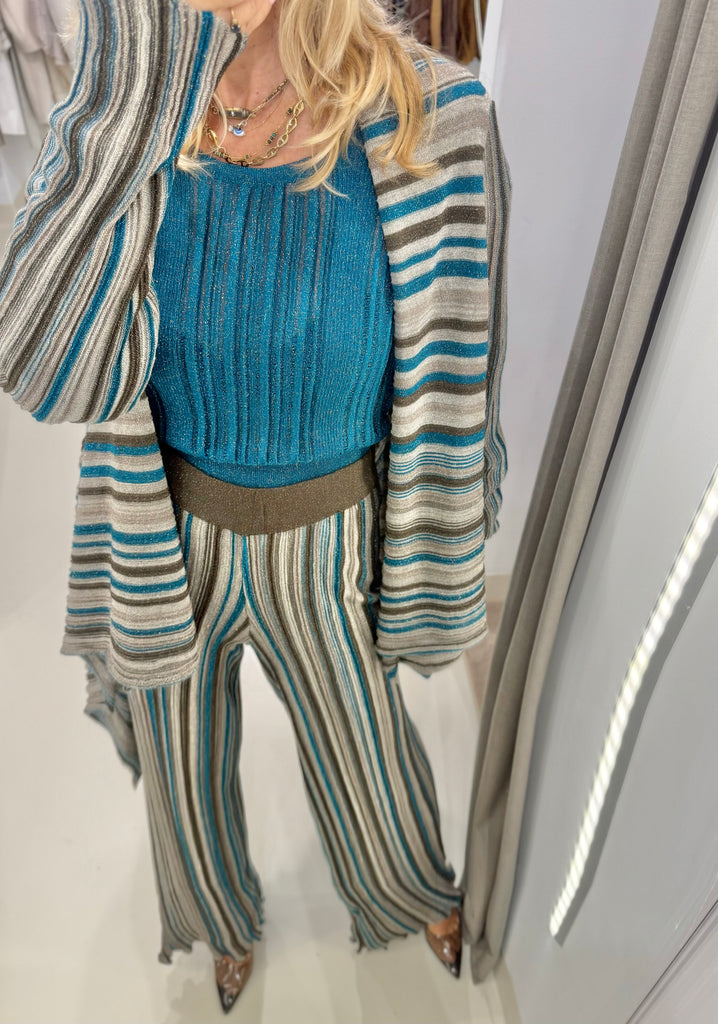 Η τριχρωμία και οι κάθετες ρίγες δημιουργούν εφέ επιμήκυνσης, ενώ η απαλή πλέξη προσφέρει ευκολία και άνεση.