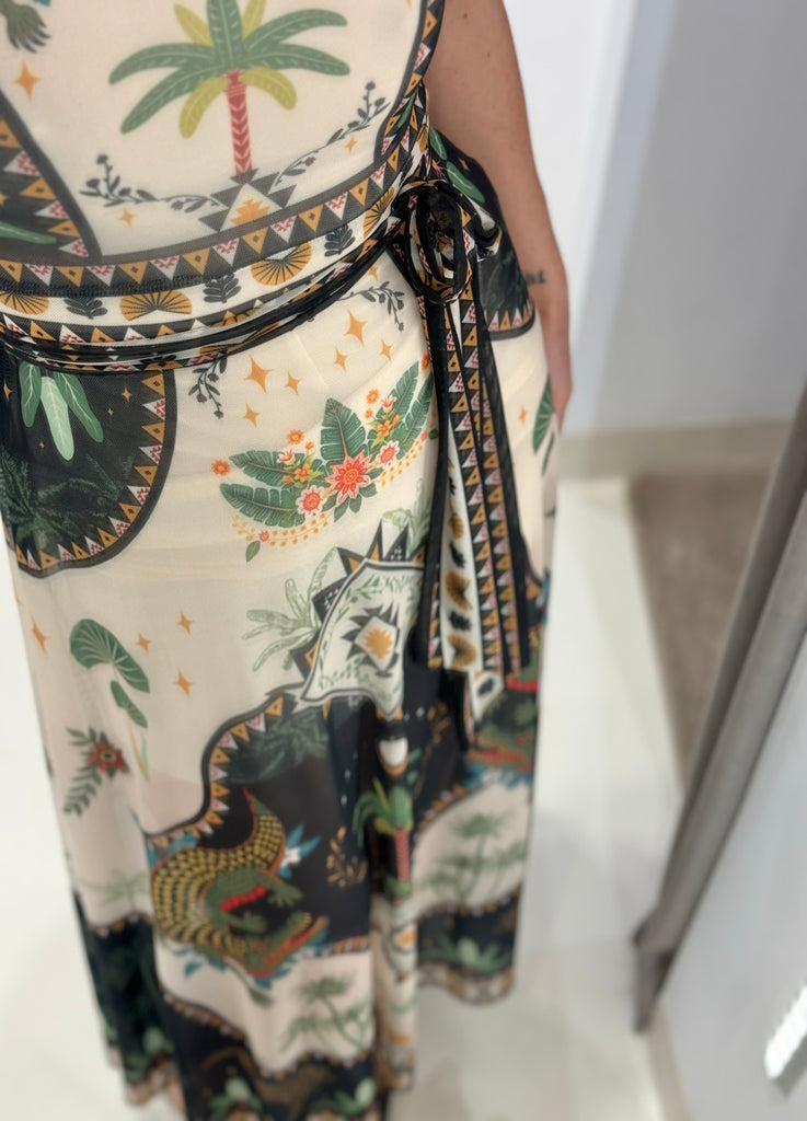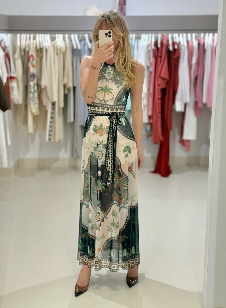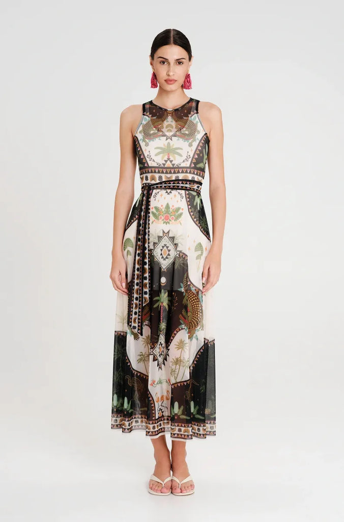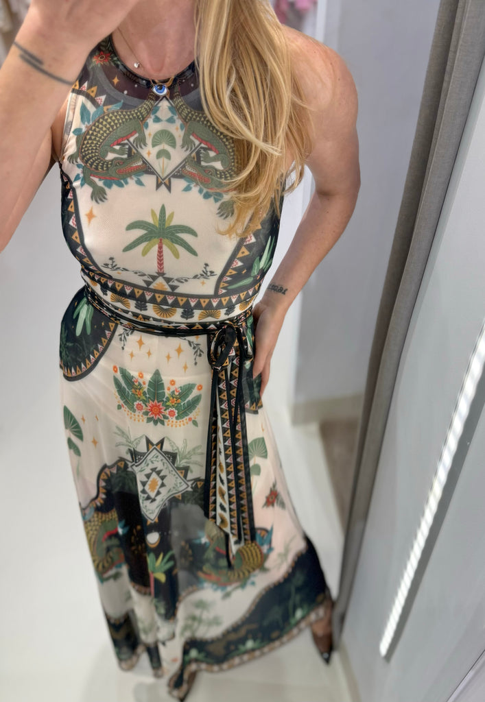 Αμάνικο φόρεμα "PEACE AND CHAOS" σε Α-γραμμή από mesh ύφασμα με placement print που απεικονίζει αρχαία σύμβολα, φοίνικες και ζώα.