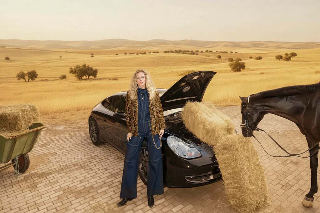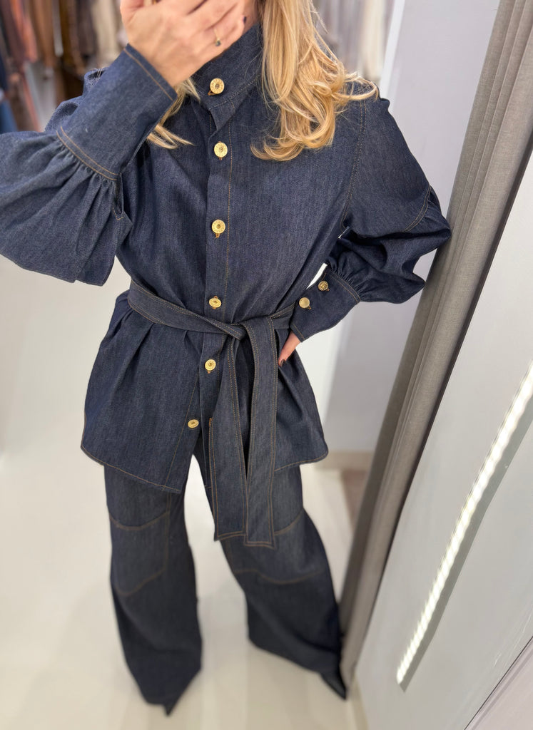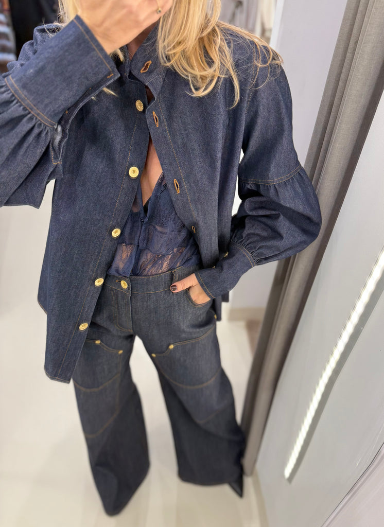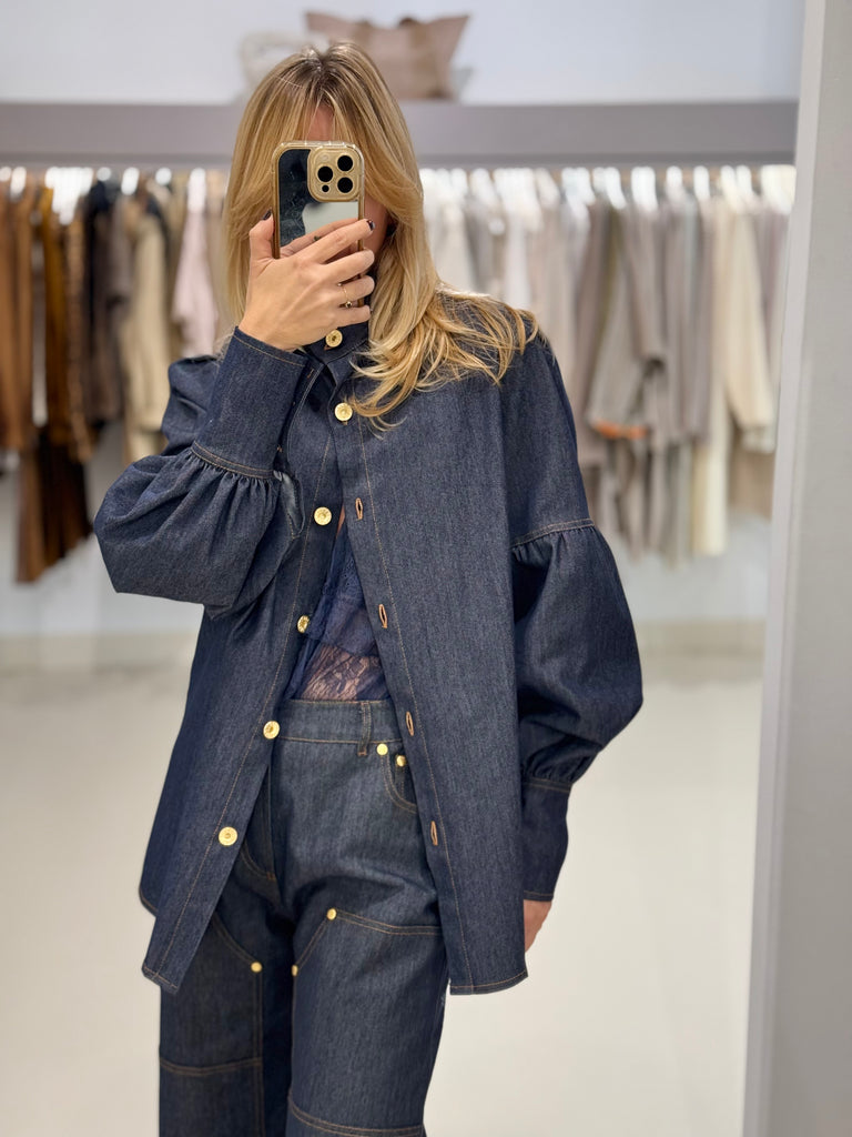 Oversized πουκάμισο denim "C.MANOLO" με φουσκωτά μανίκια και ραφές που τονίζουν τη γραμμή του.