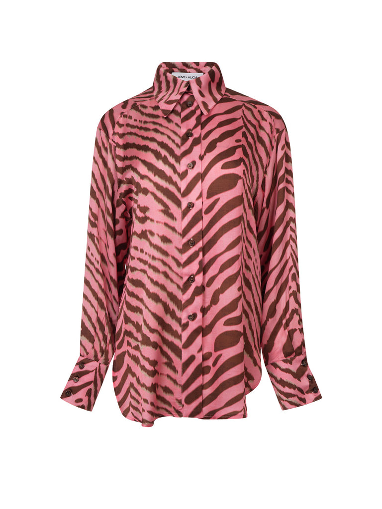 Silky-touch μακρύ πουκάμισο "LOVE AND ALICIA» σε ίσια γραμμή με μοναδικό zebra print της εταιρείας σε αποχρώσεις σκούρο καφέ και ροζ pastel ροζ.