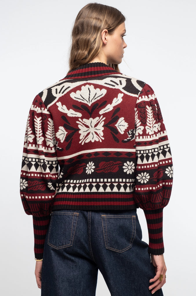Πλεκτό "PEACE AND CHAOS" με κλειστή rib λαιμόκοψη, puffy μανίκια και αντίθετα print στις μανσέτες, στο τελείωμα και στον λαιμό ενώ συνδυάζει μοτίβα σε ecru και μαύρο χρώμα πάνω σε bordeaux φόντο με την τεχνική intarsia knit.