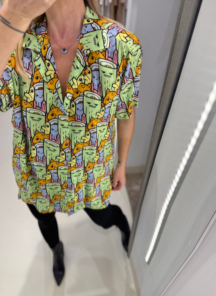 Unisex πουκάμισο "ΗΕLLO HI" από μαλακή βισκόζη με vibrant πολύχρωμα σχέδια σαν απόκομμα comic που προσδίδουν έναν pop χαρακτήρα στο outfit.