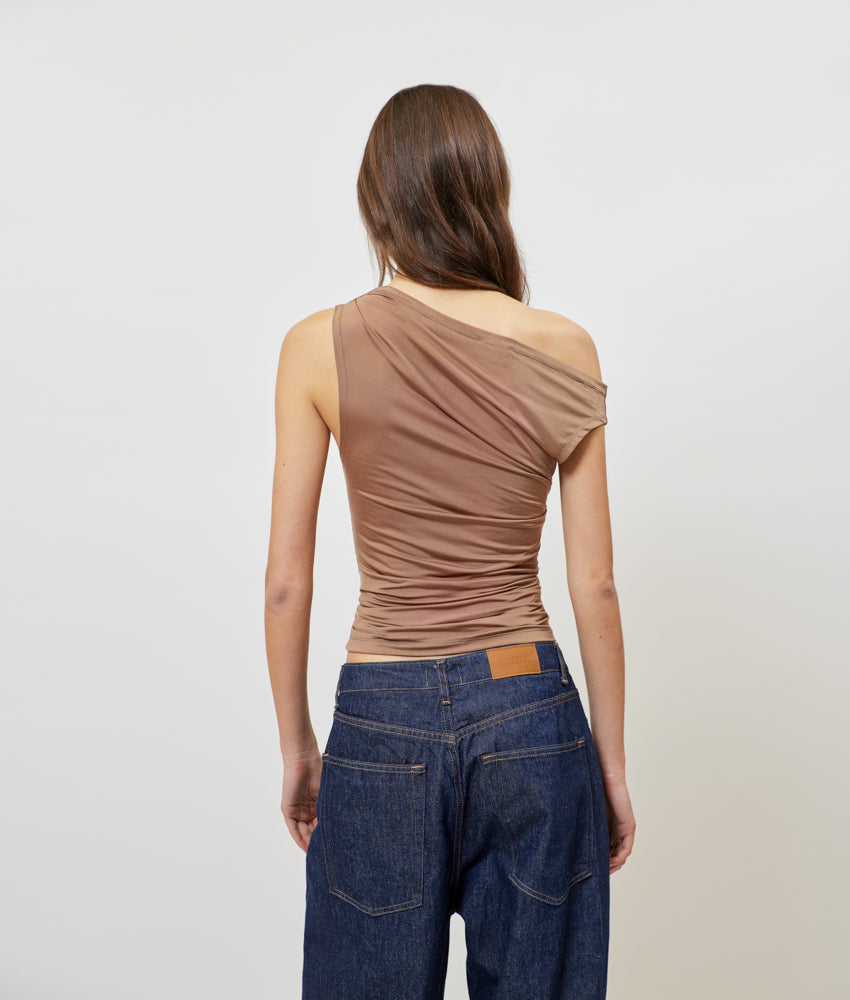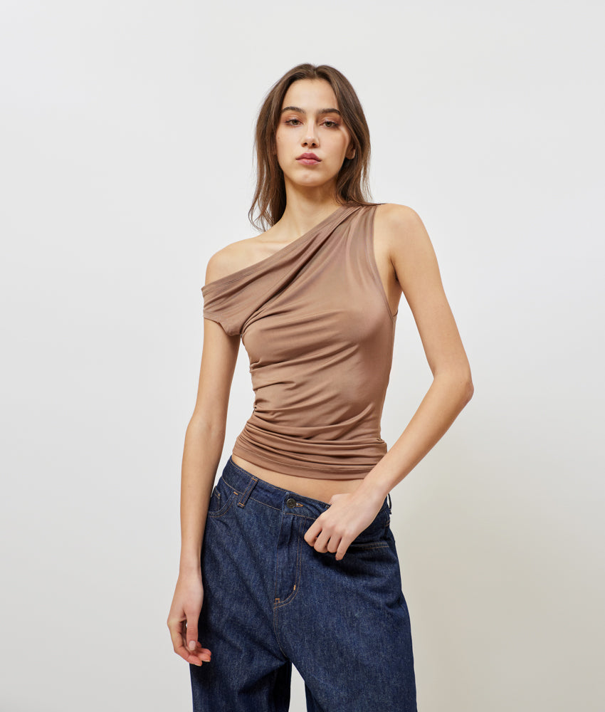 Κομψό top "SUNSETGO" σε chocolate απόχρωση με ασύμμετρο ντεκολτέ που αφήνει τον έναν ώμο ακάλυπτο και εντυπωσιακές drape λεπτομέρειες που αγκαλιάζουν το σώμα προσφέροντας μοναδική εφαρμογή.